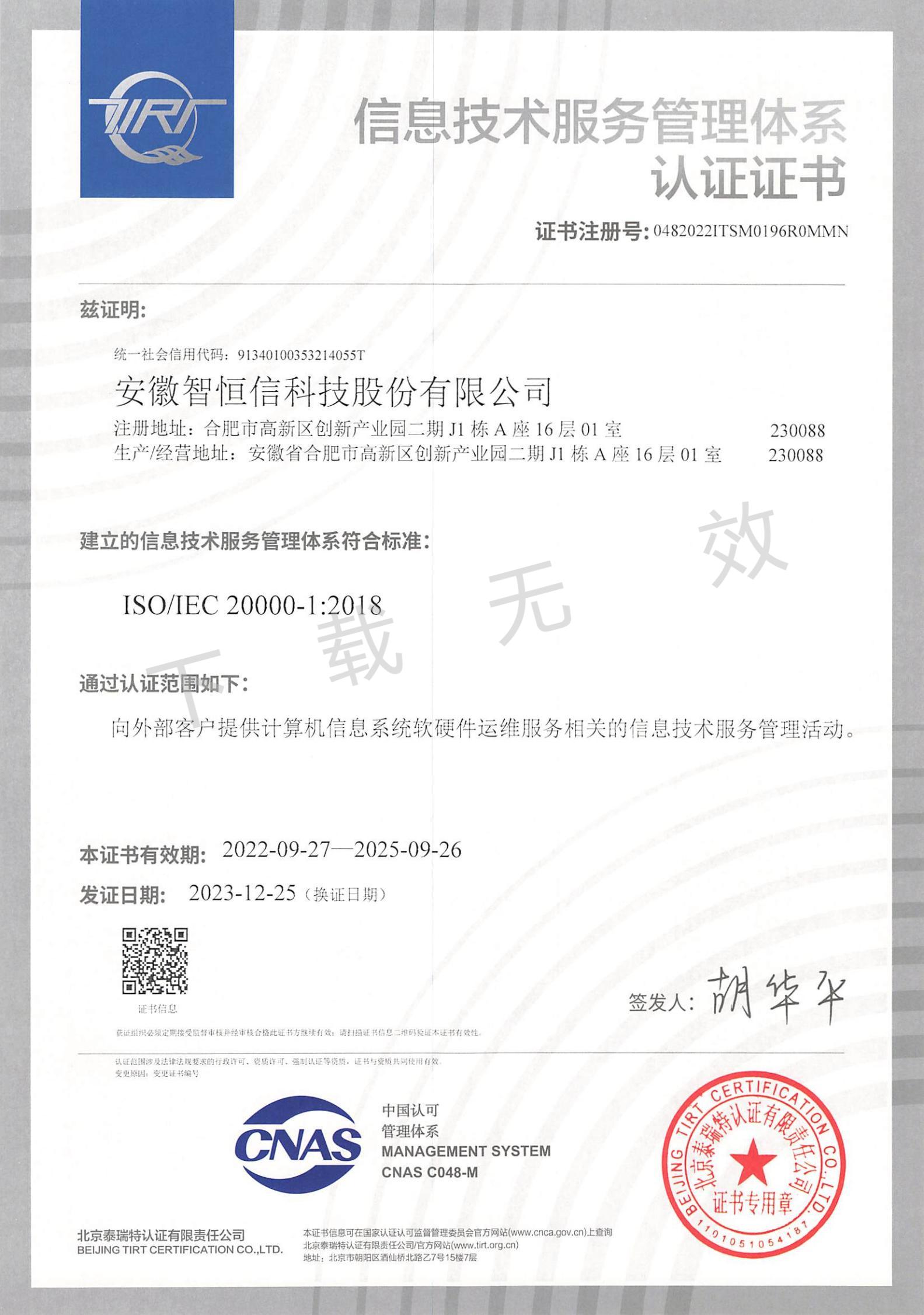 服务管理体系认证证书